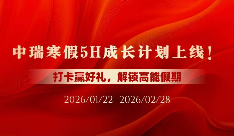 中瑞寒假5H成长计划上线!打卡赢好礼,解锁高能假期2026/01/22 — 02/28✨ 冬日启封,时光向暖 ✨告别一学期的忙碌与喧嚣寒假如期而至这不仅是休憩调整的驿站更是沉淀自我蓄